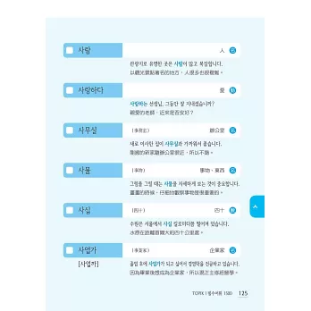 作者群依多年教學經驗及深入研究的成果,精心列出1500個初級必備單字,收錄的每個單字都是初級必備知識,若想一舉拿下TOPIK I合格證書,絕對必讀本書。