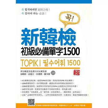 而《新韓檢初級必備單字1500新版》一書,就是崔峼熲、高俊江、朴權熙、柳多靜四位名師,累積多年實際教學經驗與研究成果,專為準備TOPIK I考試的學生所編寫的「單字寶典」!目的就是希望所有莘莘學子,能利用本書「自修」、「複習」初級重點單字,累積紮實基礎、提升備考效率,一舉通過TOPIK I閱讀、聽力二科!