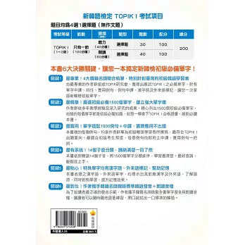 只要熟讀本書1500個單字,不僅讓您TOPIK I拿下高分穩操勝券,從此打下紮實單字基礎,同時也在無形中提升句子寫作能力,就是要讓您韓語實力更上一層樓!