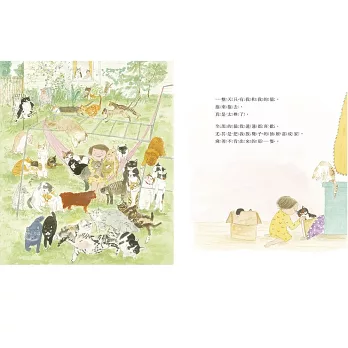 小女孩準備了橡皮球、貓薄荷、紙箱子…… 終於,奶奶家養的黑皮帶了許多朋友來。一整天都有這麼多貓咪陪伴,還有一隻窩在襪子的抽屜裡,真是太棒了!只不過,這些都是別人家的貓,心急的主人們還在街邊牆上貼了尋貓啟事,該怎麼辦呢?