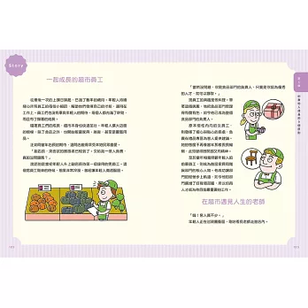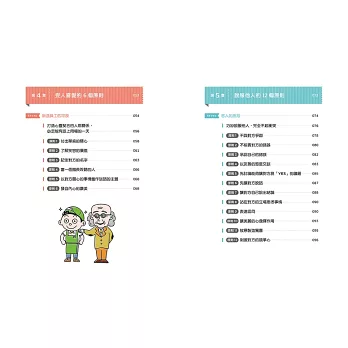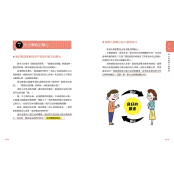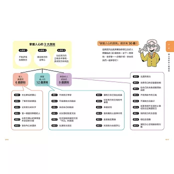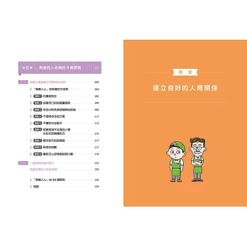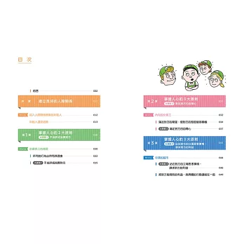除此之外,每一章都以一小段故事開啟道理。主角是一個與你我一樣擁有人際關係煩惱的年輕人,他偶然邂逅了某位「老師」,在老師的指導下學習「掌握人心的30個原則」,一步一腳印的成長。建議你可以抱持輕鬆愉快的心情閱讀這個故事,並且隨時比較主角的成長與自己的成長。