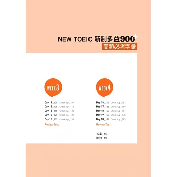 你無須沉浸在遙遙無期的寒窗苦讀中,只要4周,每周5天,每天研讀30個單字,搭配數個衍生字、近義字、例句、片語記誦,做好每個單元的10題仿真聽力練習,再完成每周的擬真複習考題,就能達成900分以上的目標。