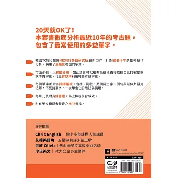 韓國「NEXUS多益研究所」由海內外頂尖英語測驗專家組成,他們定期參與多益考試,透過累積長達十年以上之真實完整考題進行趨勢分析,用最科學的方式,統計出真正的高頻出題字彙,再依程度、難度分級編排,幫助你更有效率達成多益考試目標。