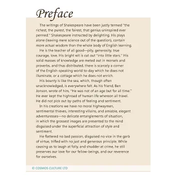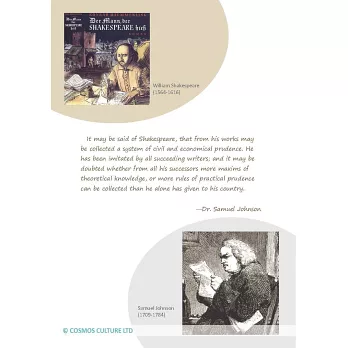 莎士比亞,為全世界所推崇的偉大作家,在他卓越的創作中所蘊含的人生智慧,啟發著世世代代的讀者。本書特別精選莎翁最著名的劇本,將之改寫為淺顯易懂的短篇故事,帶領你一探莎士比亞的文學殿堂。