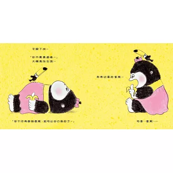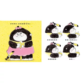 ● 「年幼的小猩猩不會剝香蕉,所以她又是哭、又是叫、又是踢的。冷靜的大嘴鳥先生來幫忙,但是反而更讓貝蒂更生氣了。當她終於準備品嚐她的點心時,香蕉斷掉了,所以貝蒂又抓狂了。大嘴鳥提醒貝蒂好幾次,她的行為是不必要的。最後,貝蒂終於能享受她的香蕉了。但最後一頁又出現一根香蕉,讓讀者再去想像一遍,這次貝蒂會怎麼做。整本書以香蕉的黃色為主調,只使用黑色、白色、粉紅色和紅色,所以能特別凸顯出經典的黃色,並與貝蒂的黑色毛皮做鮮明的對比。石磨鉛筆插畫所經營出來的筆觸和質感,讓人聯想到孩子們用蠟筆畫畫的感覺。而貝蒂重複戲劇性的行為會為讀者所津津樂道。」──《美國學校圖書館期刊》School Library Journal