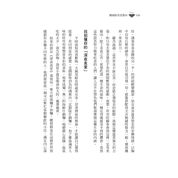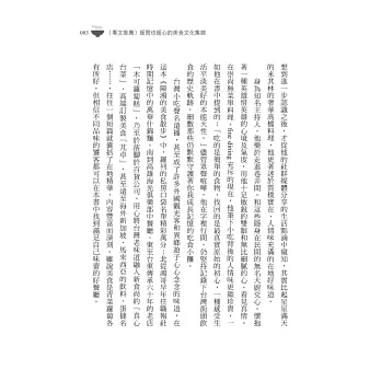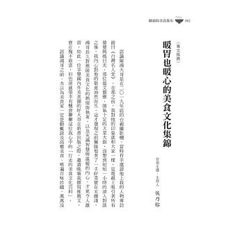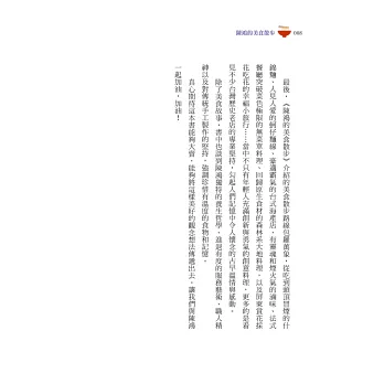 人們對美食著迷,絕不僅止於舌尖上的滿足,更引人入勝的往往是在背後所蘊含的飲食文化及人物故事。從本書中,讀者們不僅能一窺美食作家的口袋餐廳名單,更能透過他細膩的筆觸,去深究那些廚房背後的動人故事,與其說這是一本美食地圖,我倒覺得更像是一本美食文化集錦,必須經過長期積累、發自內心真誠交流,方能成就這樣一本著作。