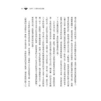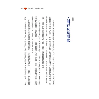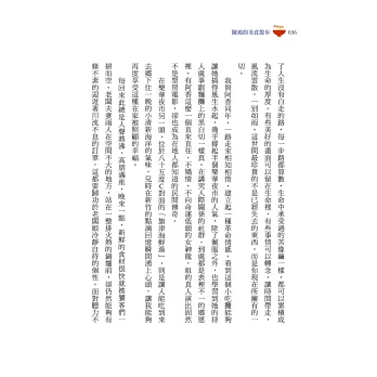 此外,這也是一本集合了人生智慧精華的心血結晶,鴻哥嚐遍了餐盤中的酸甜苦辣之外,也體會出了人生的千滋百味,如他文中所述:「做人沒有人能煩惱你,除非你拿別人的言行來煩惱自己;沒有放不下的事情,除非你自己不願意放下。日子,過的是心情;生活,要的是質量。」一種灑脫自在的人生態度,往往令聽者豁然開朗。