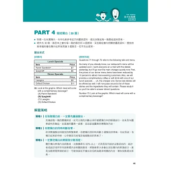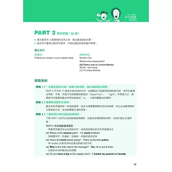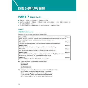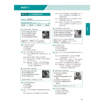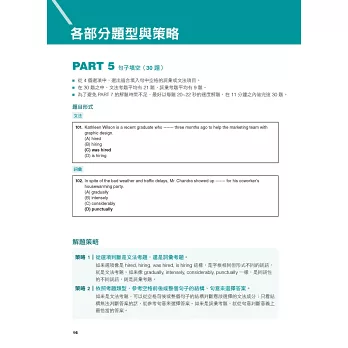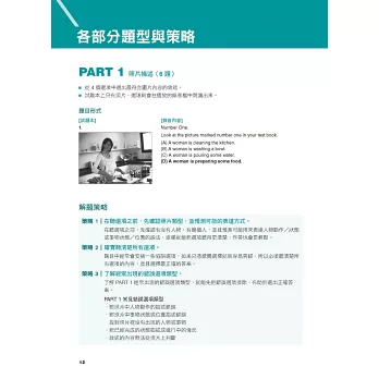 ○ 聽力篇:分類講解Part 1到Part 4的各種題型與解題策略,並搭配聽寫練習法,確實訓練「聽對、聽懂、聽出解答關鍵」的技巧。
