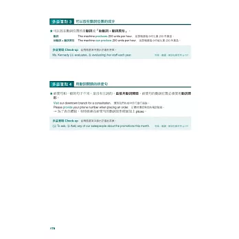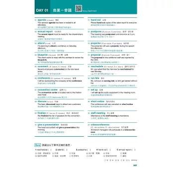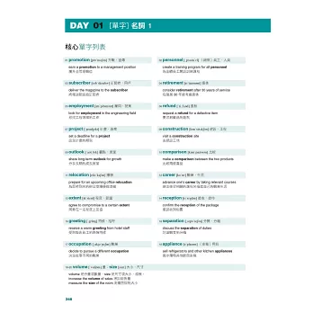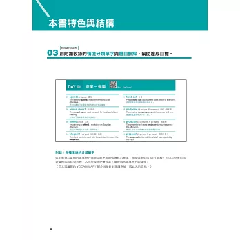 在每天的學習內容中,都有針對學習內容設計的模擬練習題,全書收錄超過1000題,提供紮實的訓練。書末更附有一回「聽力+閱讀完整試題」,供讀者檢測自己的實戰能力。另外,為了讓讀者精準學習必要的單字,書中精選了與考試重點最相關的詞彙,分別以「詞性」及「情境」兩種分類方式,整理出多益最新必考800單字&片語,而且每個條目都附有例句,提高對考試內容的掌握程度。