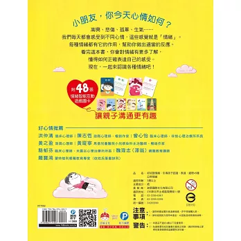 本書以圖文方式呈現45種我們的日常情緒,透過引導讓孩子認識這些情緒發生的原因、感受及解決方式,逐漸懂得面對和控制情緒的變化,並學習用好的情緒影響他人,不將壞的情緒轉移到他人身上。從小培養情緒智能,長大後更有能力面對社會上的各種挑戰,也會更容易感到快樂喔!