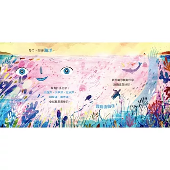 透過海洋的視角,看見不一樣的海洋。除了對海洋的基本介紹外,也包含海洋形成的原因,還有海洋生物因海洋深淺所以有不同的分布區域,以及過度開發造成滅絕的危機。讀者可以透過繪者的插圖獲得豐富的訊息,更進一步了解海底世界。最後作者以一問一答的方式,加深讀者對海洋的認識,並促使我們付出行動保護海洋。