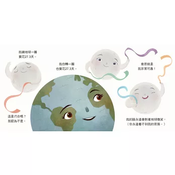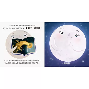 介紹月亮與地球間密不可分的關係。繪者用精美的插圖,畫出月相變化與月球引力對地球的影響,將太空縮影呈現在讀者眼前。作者用月球第一人稱的口吻,告訴讀者許多月亮的知識,讓大家更加認識月亮。