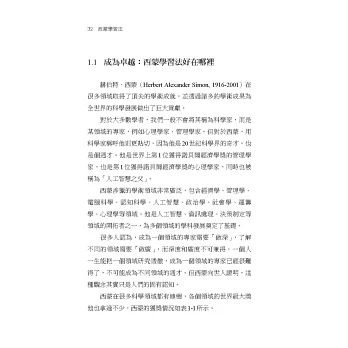 赫伯特‧西蒙是20世紀罕見的通才、「文藝復興式的科學家」,他學識淵博、興趣廣泛,研究領域橫跨經濟學、政治學、管理學、社會學、心理學、電腦科學、認知科學、人工智慧等,並做出了許多突破性貢獻,曾獲得諾貝爾經濟學獎、圖靈獎等諸多榮譽。