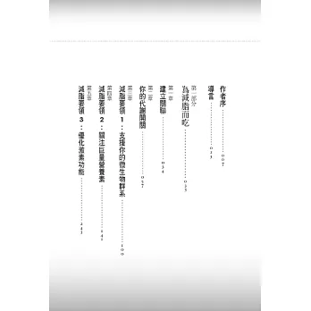 我在大學的課程中,學到的是目光極為短淺的體脂肪敘述。內容就只是這樣:當人攝入了過多的卡路里,人的脂肪就會增加。但是實情不會像是大象和吉娃娃比坐蹺蹺板一般,只是一面倒的失衡狀況。再次申明,有幾個因素控制了人體會如何處理攝取的卡路里。我們會一一深度討論這些因素,而其中最重要的因素,就是構成人體腸道的細菌(又稱微生物群系〔microbiome〕)的健康狀態。