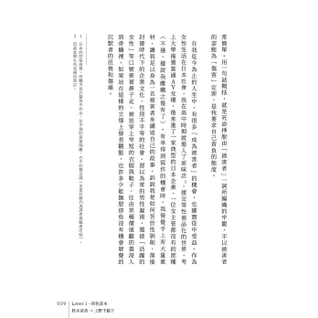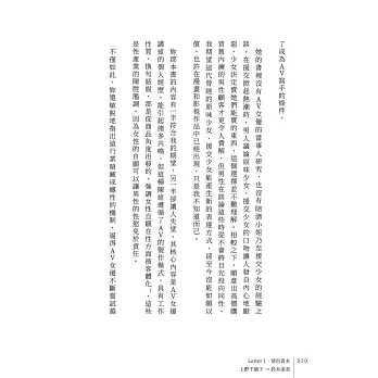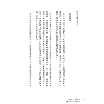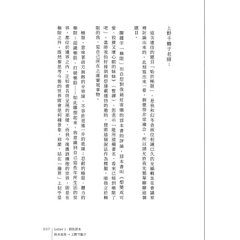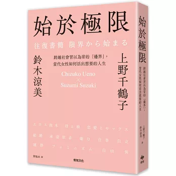 總有些人、有些書,足以鍛鍊你的靈魂、加深你的智慧。我第一次看這本書時,滿腦子的疑問都是,「鈴木涼美你為什麼要這樣?」看了第二遍、第三遍,我從上野千鶴子和她的通信裡學到,我們當然可以大膽地追問,但首先要收斂起自己的批判之心,才能看見對方的困境、聽見那微弱得不能再微弱的求救之聲。接著,也才能在信任的基礎上,與對方一起往更深層、更幽微的觸發源頭探索。「對女性『分別治理』是厭女症亙古不變的道理。」十二回的通信讓兩位經歷、個性如此不同的女性敞開心胸,把原本只能跟閨密私下耳語、揣測乃至於抱怨的話題全都搬上檯面大聊特聊,聊出了父權的結構之惡,聊出了女性的生命之難。不得不說,這真是一本所有女性的年度必讀之書!──李麗美(書評人)