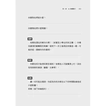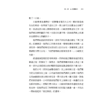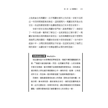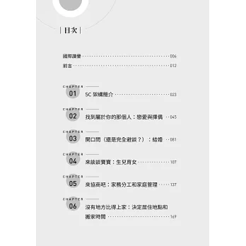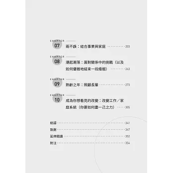 相關探討將從第二章開始,我們在這一章會檢視與選擇伴侶相關的重要決策;這些決策將為後續許多人生階段的決策奠定基調。之後各章會深入探討要不要結婚;要不要生兒育女;家務分工;決定要住在哪裡、何時要搬遷;如何結合家庭與事業;深入討論親密關係中的痛點,以及有可能發生的離婚;還有照護長輩的相關議題。最後,我們要退一步來看大局:社會規範如何變遷,而你又要如何在你的職場和社群中擔綱變革的催化劑。