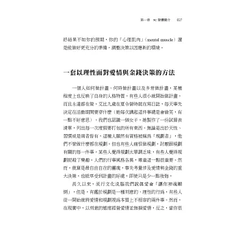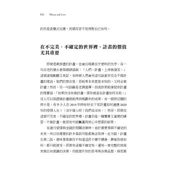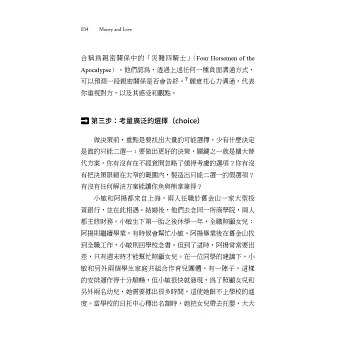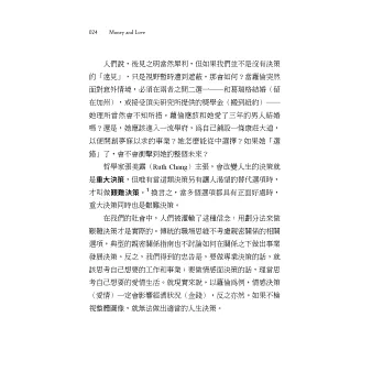 人的一生中,一定會遭遇類似在金錢與愛情之間拉扯的、令人揪心的決策。你要選人生伴侶還是事業?除此之外,你可能也必須選擇要不要結婚,或是要不要生兒育女;如何照料生病或失能的家人,或是如何面對自身的疾病或失能;選擇要住在哪裡;決定如何分配家務;決定要不要追求升遷或爭取重要職務;調和不同的花費、儲蓄和投資習慣;決定要不要兼顧育兒與事業、要的話又該如何做;要如何以及何時轉換跑道。我們可能也需要想想如何強化或結束一段關係。等父母年紀漸長,我們或許需要幫忙照護長者、做生命終點規劃。當我們自己年華老去,則必須管理退休後的人生,其中可能包括照料人生伴侶。
