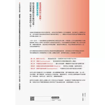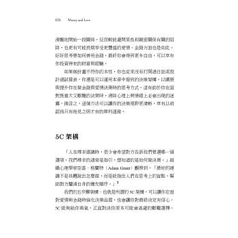 無論你如何使用本書,我們都希望你能常常回頭複習,讓書中的5C 架構幫助你更輕鬆地做決策、更有自信。我們也希望書中的故事能讓你感到安心,尤其是在生活中遭遇艱難之時,知道自己並不孤單。