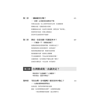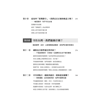 世局詭譎多變,要在台灣安身立命,須理解國際處境,並對戰爭預做準備。作者從常民的角度出發,以流暢、淺白、故事化的文字,提供豐富多元的觀點。只要重視自己與家人的生命、財產、安全,以及關心下一代的未來,這本書就值得閱讀!