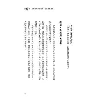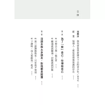 作者在書中的態度非常尊重、平視青少年,不是高高在上的說教,而是用平等的立場一起陪他們面對困難,我想這是很不容易的事。青春期時,我總覺得自己孤獨一人、沒有人理解我,如果我早點看到這本書,或是我身邊的師長、前輩能以這樣的態度去包容我,相信對我當時的身心狀態會有很大幫助。