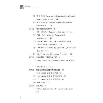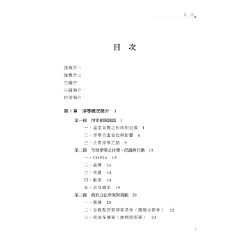 首先第一章分成兩大重點,第一部分為淨零概況的簡介,此部分分為八小節,從淨零相關議題開啟本書序幕,包括了解溫室氣體形成及其相關定義為第一節,進而明瞭淨零議題的影響及其重要性,下個階段則是濃縮到本書的主要對象——企業,面臨國際各式永續規範後,該如何研擬其淨零碳排路徑及法規,從不同碳相關名詞之解析,像是碳盤查、碳減量、碳中和……等,來對碳相關議題有初步了解。緊接著第二節,提及目前全球現有的淨零目標、倡議及行動,像是每年締約國大會(Conference of the Parties,簡稱COP)上討論氣候變遷之緩解措施,以及臺灣從2022 年開始緊鑼密鼓倡議企業實踐零碳轉型,以六大重點為目標的《臺灣2050 淨零排放路徑》,也有提及其他國家相關淨零政策,像是美國、歐盟、中國、印度、俄羅斯……等,第三節則是重點整理臺灣現有與零碳相關的政府立法草案及規範 以及美國證券交易委員會對氣候相關揭露規範的修正和歐盟的「碳邊境調整機制」草案。之後第四節則是著重在國際申報及登錄框架,像是「全球報告倡議組織」(Global Reporting Initiative,簡稱GRI) 、「聯合國責任投資原則」(Principles for Responsible Investment,簡稱PRI)、「氣候相關財務揭露」(Task Force on Climate-related Financial Disclosures,簡稱TCFD)、「永續會計準則」(SASB)、碳揭露項目全球系統(CDP Global System,簡稱CDP Global)等介紹。之後第四到第七小節,涵蓋永續評鑑之計算與檢驗方法、節能減碳相關之國際標準與規範以及永續承諾如「科學基礎減量目標倡議」(Science Based Target initiative, SBTi)、RE 100等名詞之定義與相關內容解析,最後一小節則以企業面對淨零的風險與機會時,所必須了解的一些碳名詞定義及市場風險機會、法規風險機會、技術風險機會、資金風險機會等議題作結。