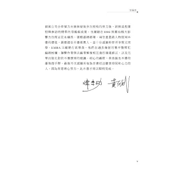 本書的完成感謝初期陽明交大科管所李雯文同學、蔡坪秘同學擔任課程助教,課後加入工工系陳貞吟同學、連倢同學進行初步課程資料整理。在經過本校管理學院多位教授們、數家個案公司合作傾力共筆與背後多次校稿的努力後,終將這些課程與參訪的精華內容編輯成冊。也謝謝在ESG 界擁有極大影響力的周志宏永續長、蒲樹盛總經理,兩位重量級人物認同本書的價值,願意擔任本書推薦人。並十分感激科管所李雯文同學、EMBA 王韻晴行政專員,他們在過去幾個月裡辛勤幫忙編碼校讀、聯繫作者與共編者繁複相互進行溝通修正,以及元華出版社對於本書實用的建議、細心的編校,皆是誕生本書的幕後推手群。最後再次感謝所有為本書付出寶貴時間和心力的人, 因為有您齊心努力,此本書才得以順利完成。