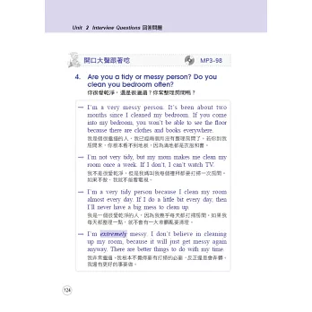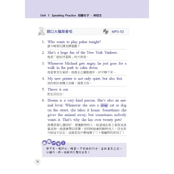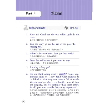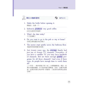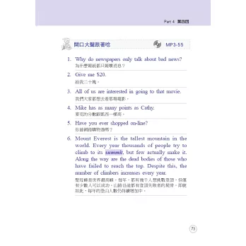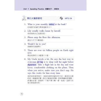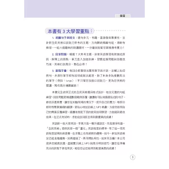 本書完全依照正式的全民英檢題目格式設計,包含完整的句組練習,回答問題更精選數個範例答覆,讓讀者可以背誦最貼切的句子。錄音詳盡真實,讓您在如臨現場的情況下,提升自己的實力;每部分都附有簡潔通順的翻譯,更貼心地加註線上MP3軌數,方便您依照自己的需要反覆練習。請讀者搭配下面的使用說明學習,方能達到最佳效果。在正式考試時,才能從容回答,並得到最優異的成績!