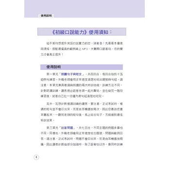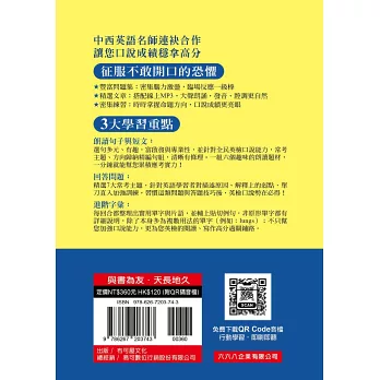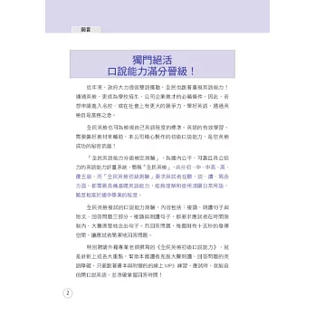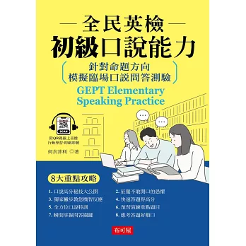 特別聘請外籍專業老師撰寫的《全民英檢初級口說能力》,就是針對上述各大重點,幫助讀者克服大聲朗讀、回答問題的英語障礙。只要跟著書本與附贈的線上MP3 練習,應試時,就能自信開口說英語,並準確掌握回答時間!