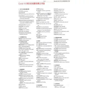 13. 附錄新增「COVID-19與防疫相關詞彙及用語」,分單元如下:1.病名及病毒相關詞彙,2.防護器具用品,3.醫療護理,4.篩檢,5.病例類型,6.傳播感染型態,7.疫情描述,8.病理症狀,9.防疫控管,10.疫後經濟,11.其他相關詞彙。