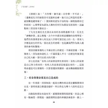 二、中國國力崛起、經濟起飛貧富懸殊,大家爭相向錢看,故思考為文引導可以「心想事成」外,更應該注意因果關係。奧運、世博已給國民禮讓、排隊的好風氣,若再加上本書強調的立命、改過、積善、謙德,則多一些軟實力,更可傲視群倫、冠蓋群芳。