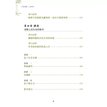 五、根據《商業周刊》的實地大規模調查,大陸八○後(台灣稱七年級生)的新一代,並非我們原來所想像的脆弱和自大,反而他們要公平、要誠實、要團體合作,這就是「心」時代的開始,我們有機會在高科技的帶領下,降低資源耗損,提高資訊交流的便捷,帶動「克己復禮」的規範,而此書更是可作為圭臬,帶來無窮的希望與新局。