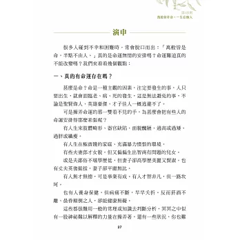 這一生好像與《了凡四訓》這本書脫不了關係,30多年前偶然看到此書,驚為天人,當下就誓言要把古體文改為現代語句,花了好幾年的時間和精力,但突然市場出現了現代本,我只好把改好的稿子收起,可是心裡頭的願望並沒拋開,隨著時代變化,我是一路改進裡面的結構,終於心想事成,1998年出版專為保險人寫的《行銷心經―了凡四訓與壽險行銷工作者》。