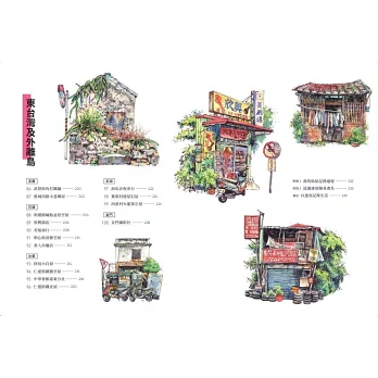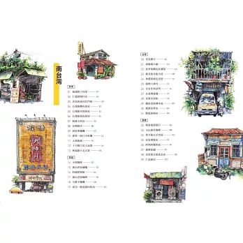 作者把細心投射在目光,透過手上的畫筆,把景象如同化學效應般拓印在紙裡。景物需要人調味,建築需要人走動,拿著這本書按圖索驥,逛逛台灣這座繽紛又溫暖的叢林。──阮光民