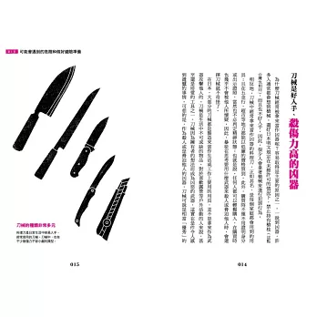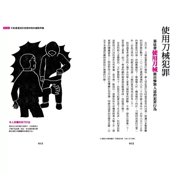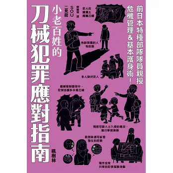 由於刀械是日本發生的犯罪事件中最常見到的凶器,因此,本書將書名訂為《小老百姓的刀械犯罪應對指南》。頁數比例上,有一大部分是刀械犯罪的情境,不過也有部分是刀械以外的凶器。之所以會如此安排是因為應對刀械行凶的方法,基本上與其他凶器(鈍器、可燃物、槍械、爆炸物等)大致相同。當然,在遭遇槍械或爆炸物攻擊時,也需要其他的應對方法,例如趴下等。但是採取行動的優先順序(逃跑、躲藏、搏鬥)與平時要注意的有許多相同之處。畢竟無法預先得知暴徒會在何時、何地,以何種凶器行凶。希望即使遭遇刀械以外的攻擊時,各位也能運用本書的內容進行應對。此外,若是對刀械以外的應對方法有興趣的話,請參考本書的共同作者SOU所著的《小老百姓的戰場行動守則》(楓樹林出版社)。