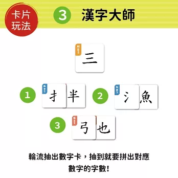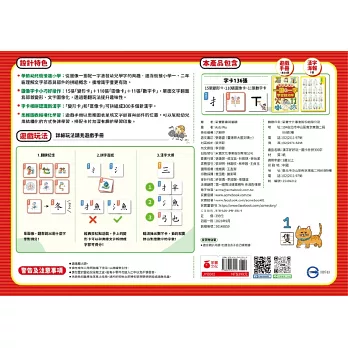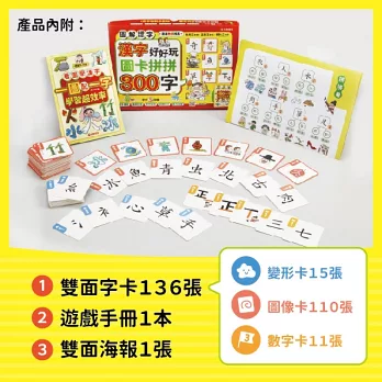 1. 小巧方形好拿好操作字卡:15張雙面「變形」卡、11張雙面「數字」卡、110張雙面「圖像」卡,單面字符翻面部首變形、文字圖像化,透過翻翻玩法提升趣味性。