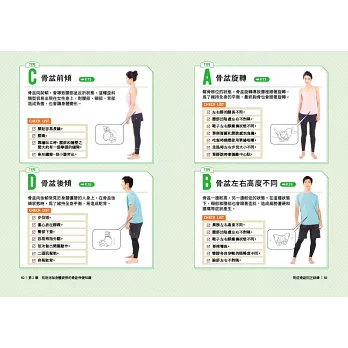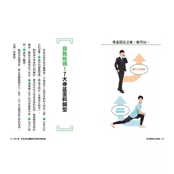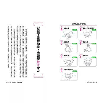 3. 提供超詳盡的「7大骨盆歪斜種類」的身體外觀、行為模式的評判方式,幫助讀者快速找出問題點。