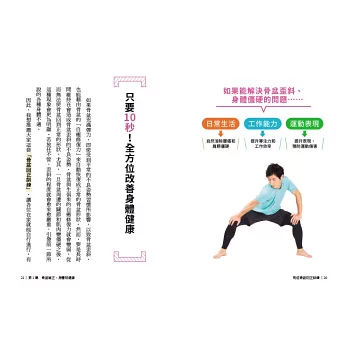 雖然時時提醒自己端正姿勢很重要,但要落實在日常生活中卻相當困難,不過只要透過本書的各種伸展和訓練動作,就能幫助骨盆在「日常磨損歪斜」和「自動恢復正常骨盆形狀」之間保持平衡,常保骨盆與身體健康。切記,只要骨盆不歪斜,保持靈活彈力,就能為全身帶來正面影響,進而提升健康、工作、運動等表現。