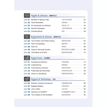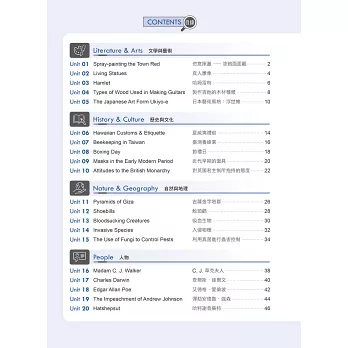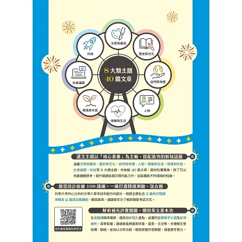 涵蓋文學與藝術、歷史與文化、自然與地理、人物、健康與生活、環境與天氣、社會議題、科技等8大類主題,共收錄40篇文章,題材包羅萬象。除了可以培養邏輯思考,提升閱讀各類文章的能力外,並能獲取不同領域的知識。