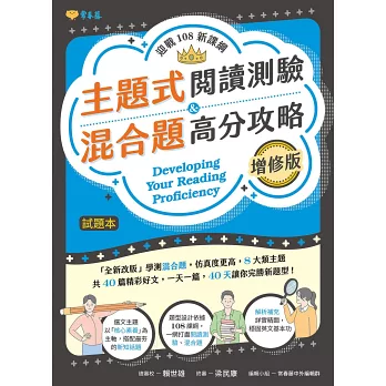 針對大考中心公布的大學入學考試命題方向設計,每類主題包含3篇新式閱讀測驗及2篇混合題題組,擬真度高,讓讀者充分了解新題型考試方式。