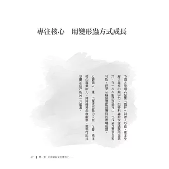 生命本是不斷探索、學習、反省的過程,這本看似談論經營、投資與職場的書,其實最讓人受用的,是經營人生的心法,讓我們面對不同的境遇、生命階段,都能找到屬於自己的答案。