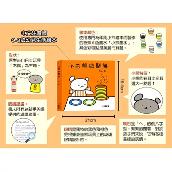 《小白熊做鬆餅》系列誕生於1970年。主人公小熊圓圓胖胖的身體、「へ」字型的嘴巴、簡簡單單的圍裙,就是這麼一隻小熊,成為了家喻戶曉的經典形象,出版50多年來廣受日本讀者的喜愛。
