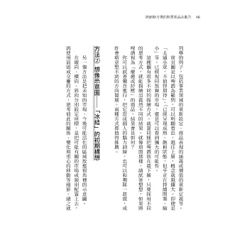 做企劃最常遇到的問題就是沒靈感,作者特別分享了讓想像力爆發的技巧,例如:「超越、極端、逆轉發想法」、利用「多重標籤」整理腦內資訊。除了解說成功案例,也徹底分析滯銷商品的問題點,並指出失敗案例應該怎麼做才能獲得重生。