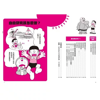 每次遇到自訂題目研究或報告的作業,總是人想破頭,但這其實是培養獨立思考能力與個人興趣的好方法。哆啦A夢帶你認識自由研究的重要程序:擬定題目→資料收集→進行實驗→驗證檢查→觀察記錄→總結報告。書中有30種生活科學實驗主題可供參考,如日晷、種子飛機、神奇的水質試紙等。跟著哆啦A夢與大雄一起挑戰自由研究吧。