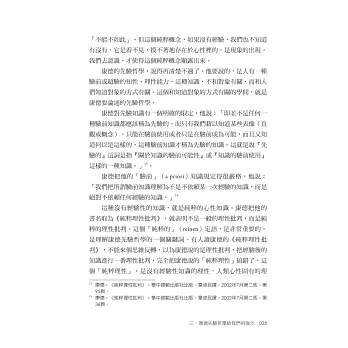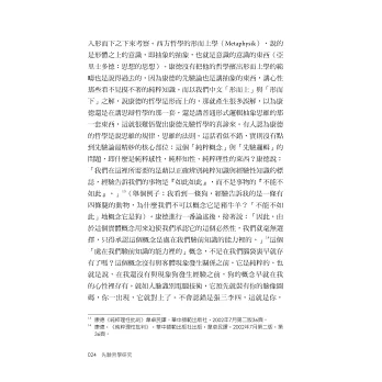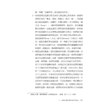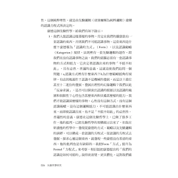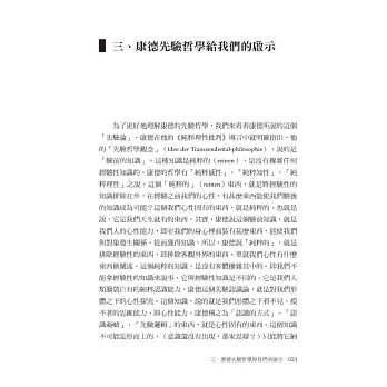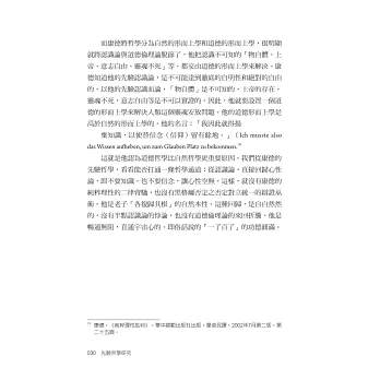 其一,作者非常敬佩歐洲18世紀一位哲學大師─把形而上學起死回生的康德(lmmanuel Kant,1724-1804)。認為康德最大成就在於他的「先驗論」,就是「我們的認知如何成為可能的?」人的心性在和外在事務接觸,產生作用(經驗)以致生成知識之前,必然天生有「主觀認識能力」才會起相互作用。這種人類天成的認識能力被康德以科學方法證明了。(頁212)