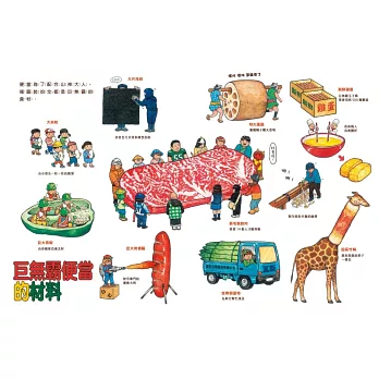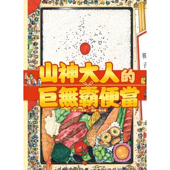這本繪本玩的是「巨無霸」的遊戲,一雙筷子得要20個大人才抬得動,一粒米得一個小孩才背得動。製作便當的過程,和平常都不一樣了!如何製作一個山神大人滿意又能飽20年的巨無霸便當,就在這本繪本完整開箱了。――蔡幸珍(資深閱讀推手)