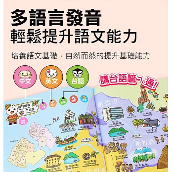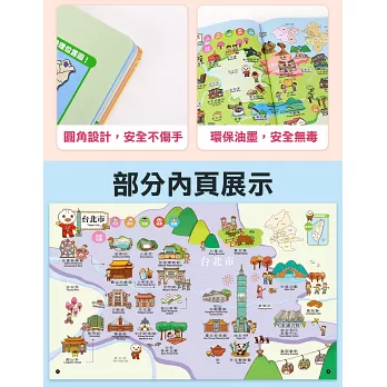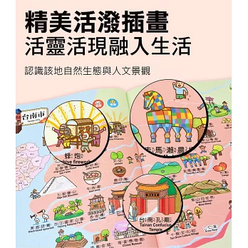 在各縣市單元中,認識該地自然環境、特有動物、豐富景點與美味特產等知識,搭配精美活潑的插畫,讓縣市不只是名稱,活靈活現的融入生活當中。