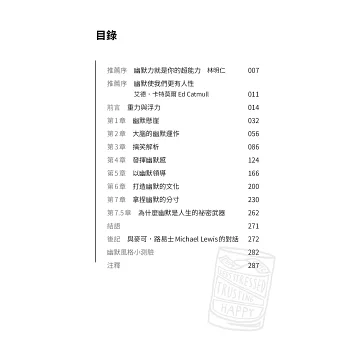 從高人氣脫口秀和喜劇現場、白宮辦公室開會實況、美國國務卿與俄國外長的政治角力場合,以及蘋果、Google和皮克斯的辦公室,再到巴菲特的年度股東大會上,兩位作者透過精彩、有趣的實例,介紹了幽默的技巧和應用。