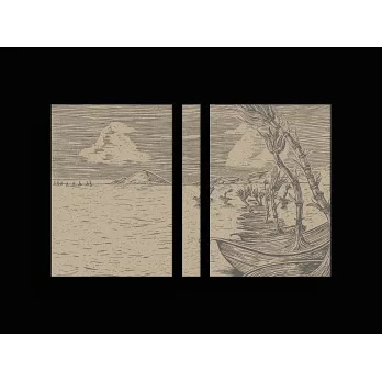 在畫面中架構了似窗框的景象,也隱含了以外部視角來觀看本書所講述與建構的故事景貌。紙材的選用將版畫圖樣的甘蔗與木船紋理作為貼合,也希望帶給讀者從觸摸到書籍作品開始,便已啟動這特別的閱讀體驗與漂流旅程。──黃嘉宏