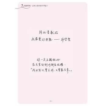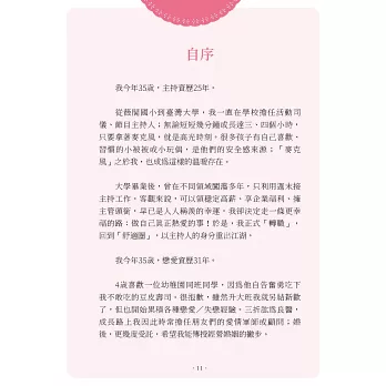 主持、寫作是我的最愛,《婚禮現場:主持人為什麼不早說?》為兩者之結晶,當然有 200%熱情投入其中。再次感謝先生志鋼、兒子大福、女兒愛,謝謝你們陪伴、成全我的夢想,感謝薇閣師長們的教育和栽培,感謝最帥老爸、永遠最美媽咪給我的所有,感謝上帝。