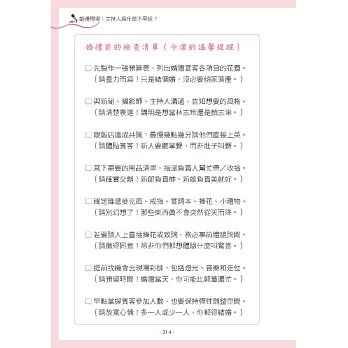這本書是新人預備心的「婚前幸福手冊」,藉由許多有趣故事和實例,提醒大家謹慎小心,不要掉進情緒陷阱;別因籌備過程的疏忽,失去婚禮的幸福感!這些溫馨提示,實在太重要了!